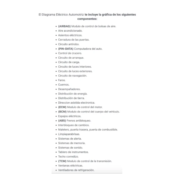 El Diagrama Eléctrico Automotriz te incluye la gráfica de los siguientes componentes: