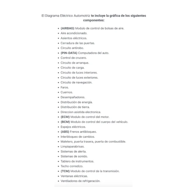 El Diagrama Eléctrico Automotriz te incluye la gráfica de los siguientes componentes: