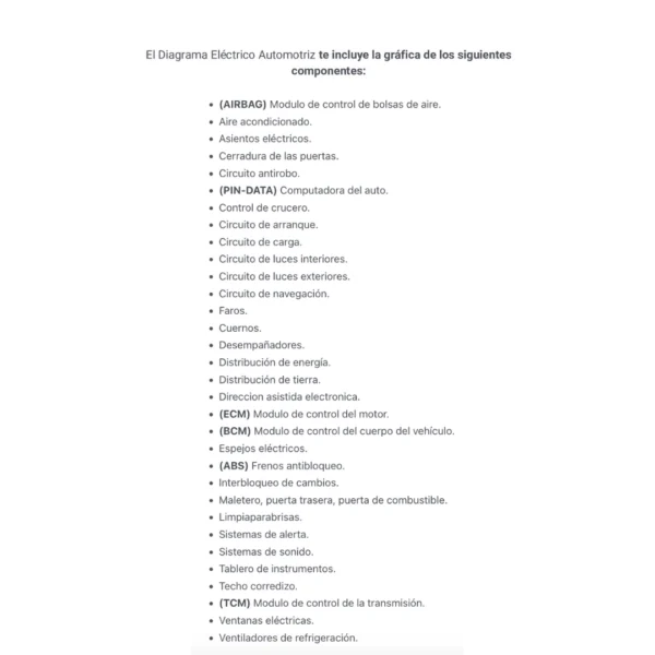 El Diagrama Eléctrico Automotriz te incluye la gráfica de los siguientes componentes: