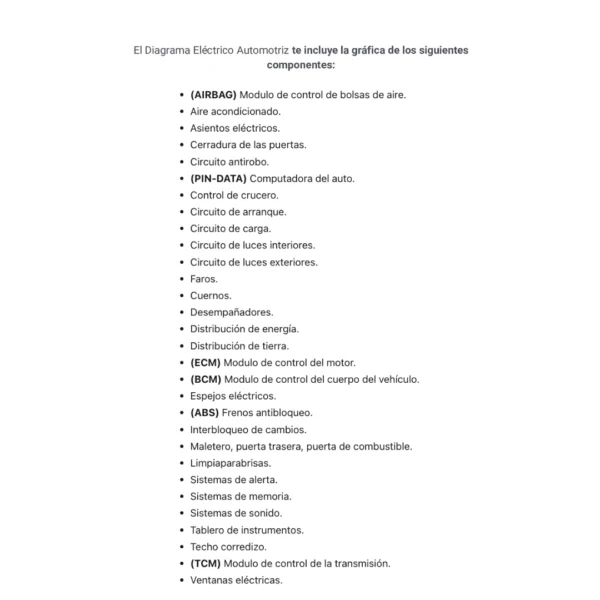 El Diagrama Eléctrico Automotriz te incluye la gráfica de los siguientes componentes: