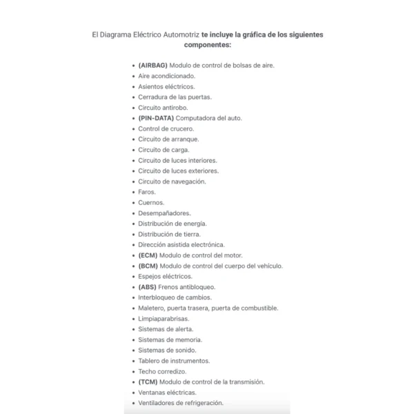 El Diagrama Eléctrico Automotriz te incluye la gráfica de los siguientes componentes: