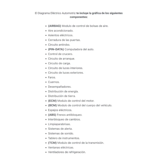 El Diagrama Eléctrico Automotriz te incluye la gráfica de los siguientes componentes: