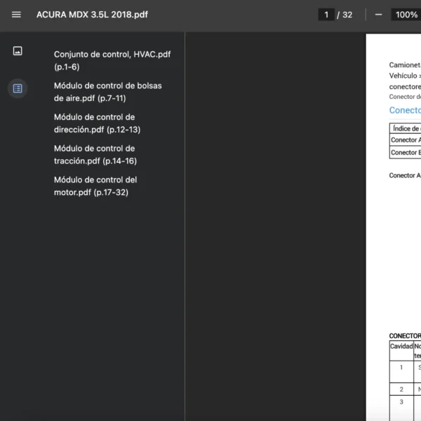 Este diagrama de pines o mapa de pines detalla la asignación de cavidades y señales para el ACURA MDX 3.5L 2018. Su objetivo es acelerar pruebas con multímetro/oscopio, reducir tiempos de diagnóstico y evitar errores al intervenir conectores críticos.