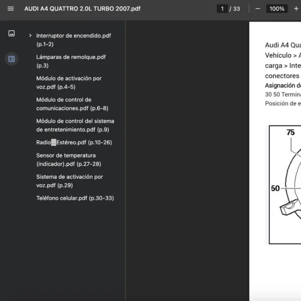 PDF visible en teléfono, tablet y PC; compatible solo con AUDI A4 QUATTRO 2007. Si requieres otra variante/modelo, contáctanos.