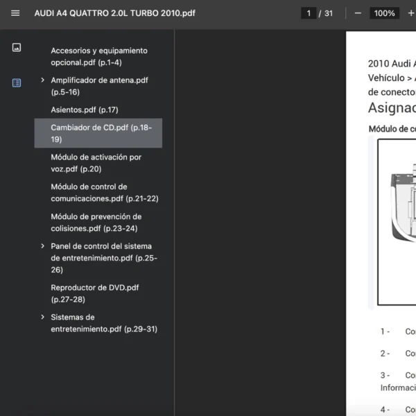 PDF visible en teléfono, tablet y PC; compatible solo con AUDI A4 QUATTRO 2010. Si requieres otra variante/modelo, contáctanos.