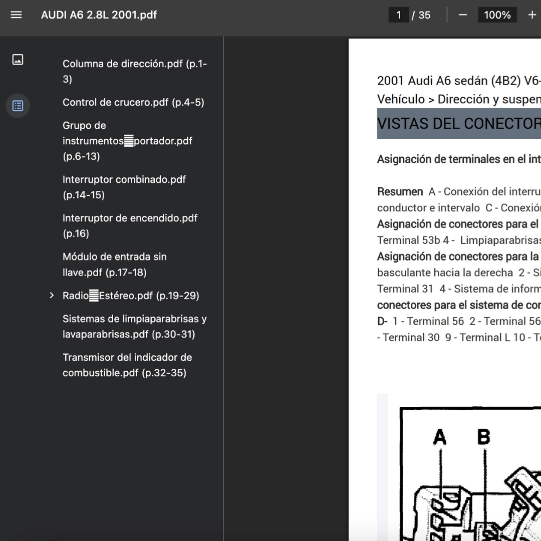 PDF visible en teléfono, tablet y PC; compatible solo con AUDI A6 2001. Si requieres otra variante/modelo, contáctanos.