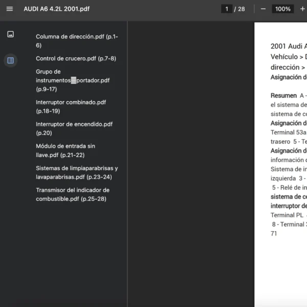 PDF visible en teléfono, tablet y PC; compatible solo con AUDI A6 2001. Si requieres otra variante/modelo, contáctanos.