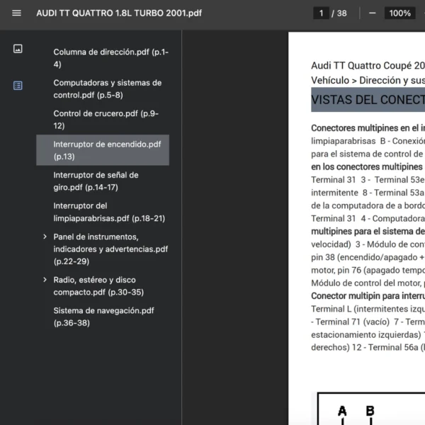PDF visible en teléfono, tablet o PC; lectura clara para uso en taller. Compatible solo con AUDI TT QUATTRO 2001. Si requieres otra variante/modelo, contáctanos.