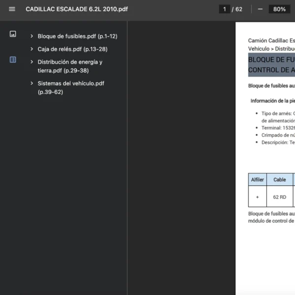 PDF visible en teléfono, tablet o PC; compatible solo con CADILLAC ESCALADE 2010. Si requieres otra variante/modelo, contáctanos.