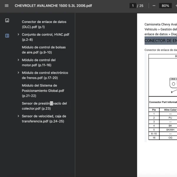 PDF visible en teléfono, tablet o PC; compatible solo con CHEVROLET AVALANCHE 1500 2006. Si requieres otra variante/modelo, contáctanos.