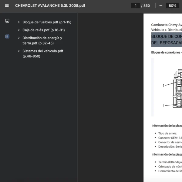 PDF visible en teléfono, tablet o PC; compatible solo con CHEVROLET AVALANCHE 2008. Si requieres otra variante/modelo, contáctanos.