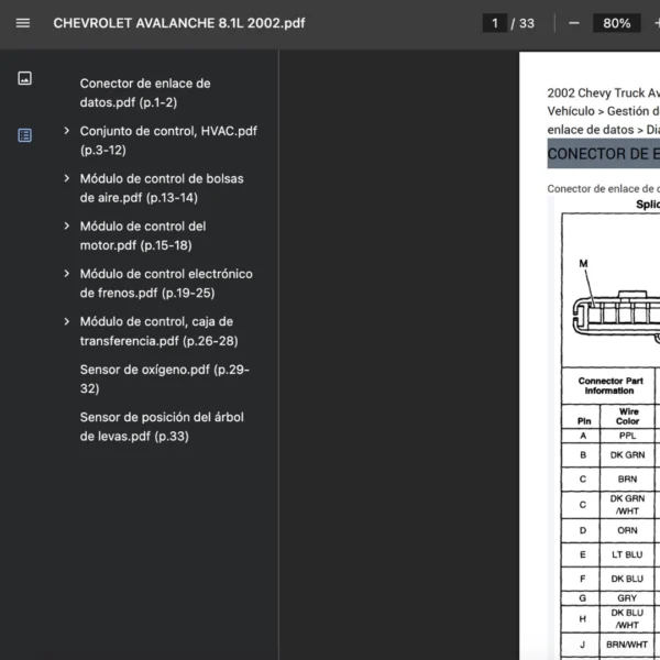 Sé el primero en valorar “Pin Out / Vista de Conectores CHEVROLET AVALANCHE 8.1L 2002 PDF”