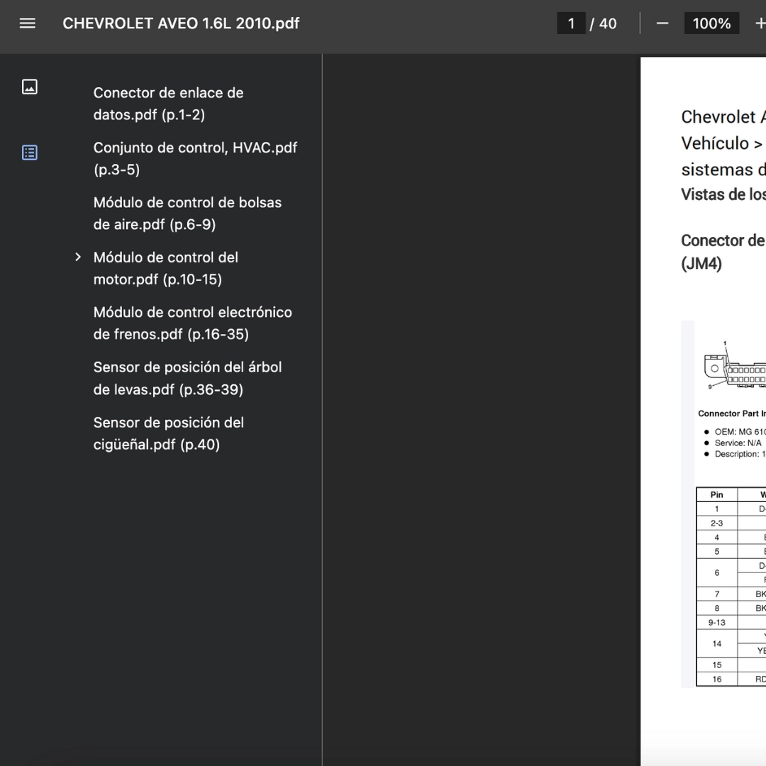 Este pinout o diagrama de pines compila vistas y funciones del CHEVROLET AVEO 1.6L 2010. Permite ubicar 12 V, 5 V, tierras y señales para medir continuidad o caídas de tensión con multímetro u osciloscopio, acelerando el diagnóstico en tren motriz, SRS, HVAC y ABS.