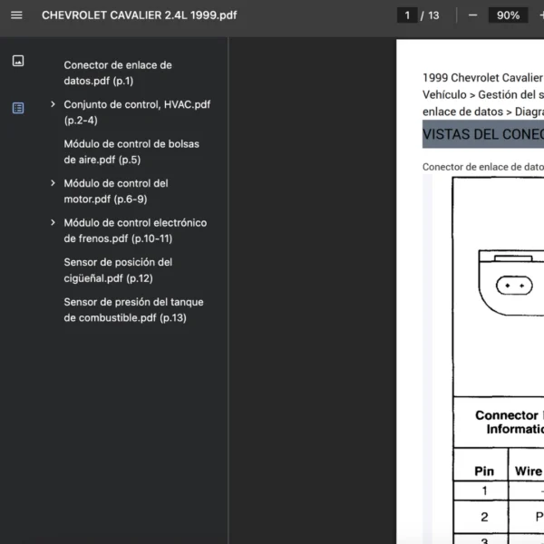 Este diagrama de pines o referencia de pines concentra la asignación de terminales y vistas de conectores del CHEVROLET CAVALIER 2.4L 1999. Permite verificar alimentación, tierra, continuidad y señales en tren motriz, HVAC, SRS y ABS con pruebas dirigidas por pin, reduciendo tiempos y evitando desmontajes innecesarios.