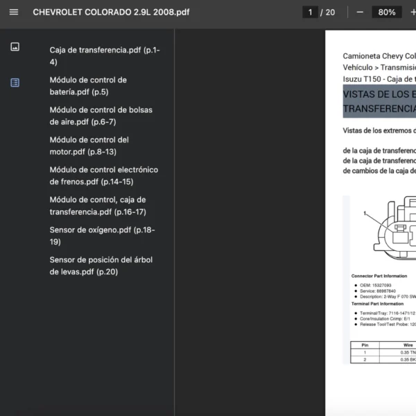 PDF visible en teléfono, tablet o PC; compatible únicamente con Chevrolet Colorado 2.9L 2008. Si requieres otra variante/modelo, contáctanos.