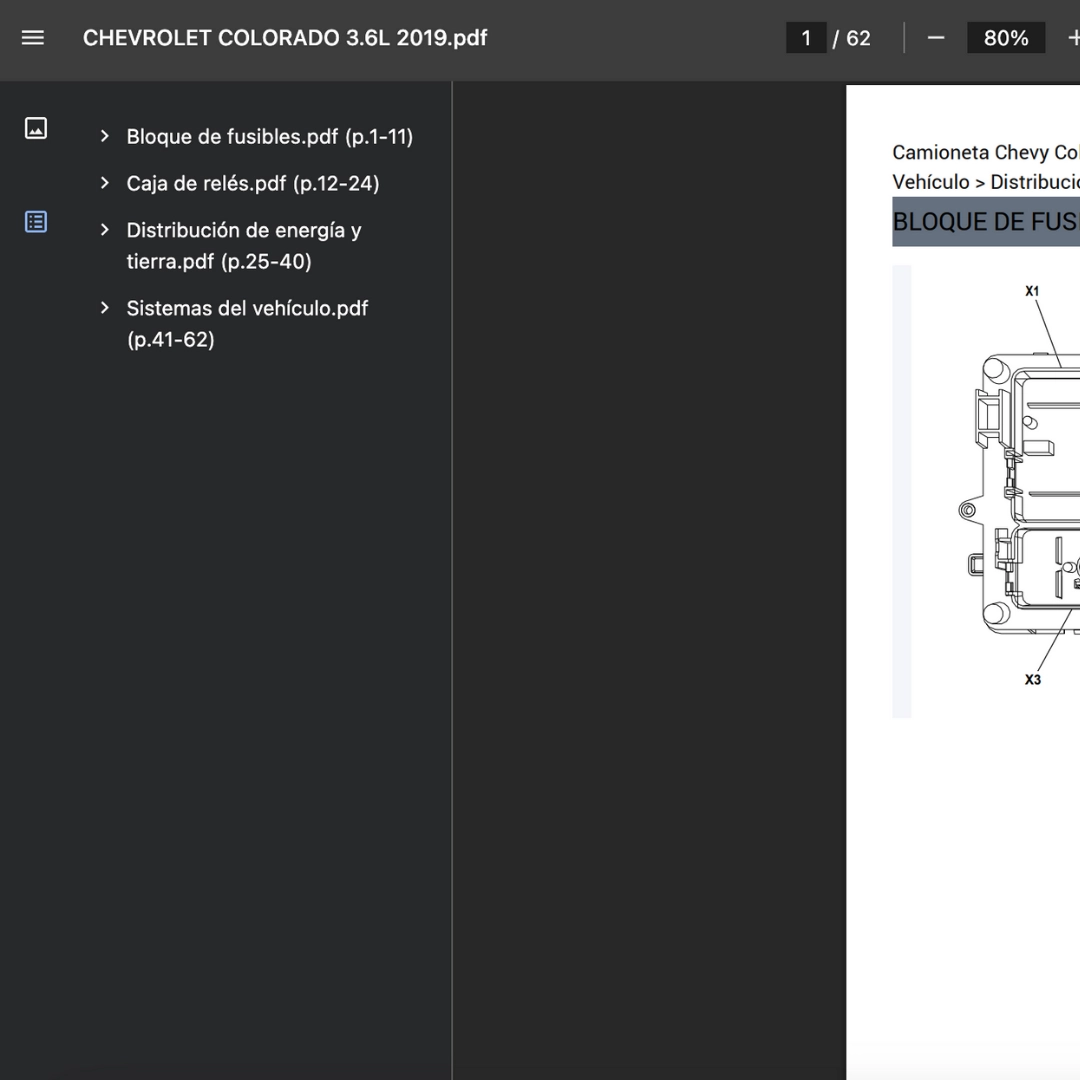 PDF visible en teléfono, tablet o PC; compatible únicamente con Chevrolet Colorado 3.6L 2019. Si requieres otra variante/modelo, contáctanos.