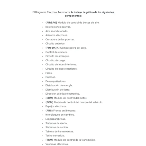 El Diagrama Eléctrico Automotriz te incluye la gráfica de los siguientes componentes: