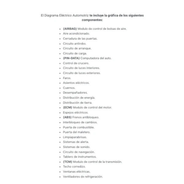 El Diagrama Eléctrico Automotriz te incluye la gráfica de los siguientes componentes: