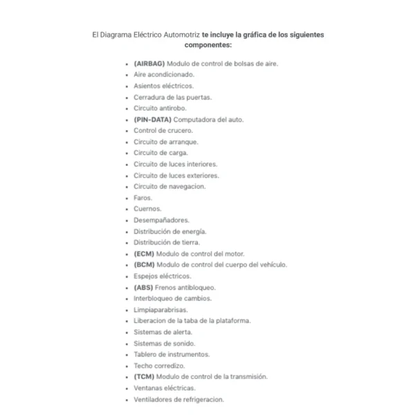 El Diagrama Eléctrico Automotriz te incluye la gráfica de los siguientes componentes: