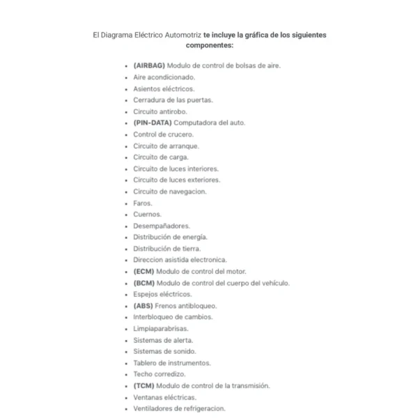 El Diagrama Eléctrico Automotriz te incluye la gráfica de los siguientes componentes: