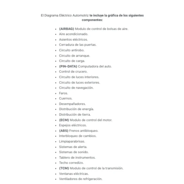 El Diagrama Eléctrico Automotriz te incluye la gráfica de los siguientes componentes:
