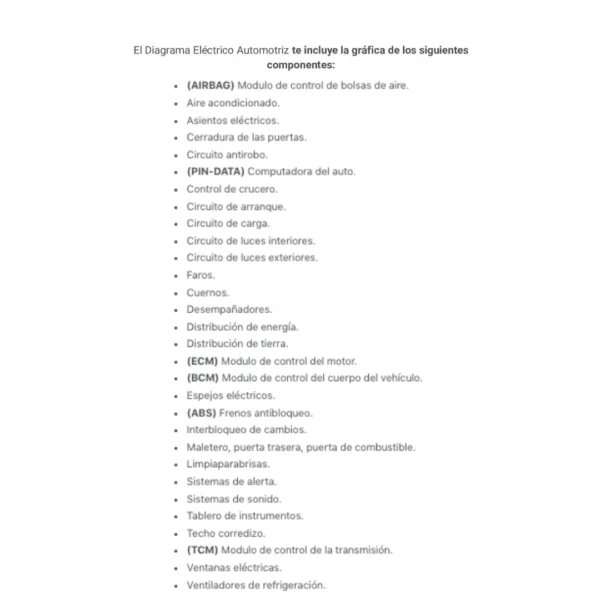 El Diagrama Eléctrico Automotriz te incluye la gráfica de los siguientes componentes: