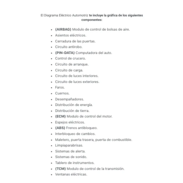 El Diagrama Eléctrico Automotriz te incluye la gráfica de los siguientes componentes: