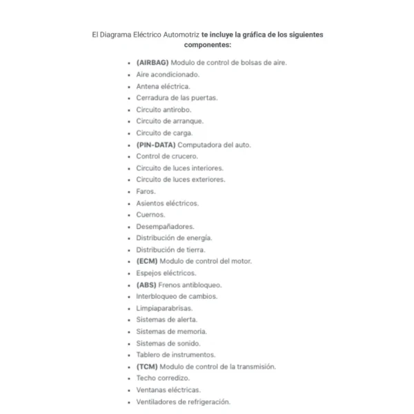 El Diagrama Eléctrico Automotriz te incluye la gráfica de los siguientes componentes: