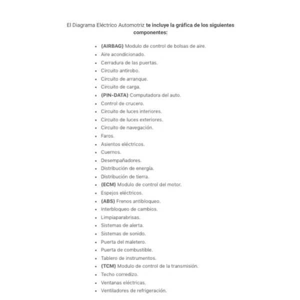 El Diagrama Eléctrico Automotriz te incluye la gráfica de los siguientes componentes: