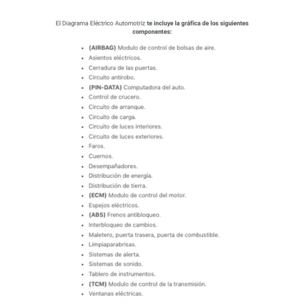 El Diagrama Eléctrico Automotriz te incluye la gráfica de los siguientes componentes: