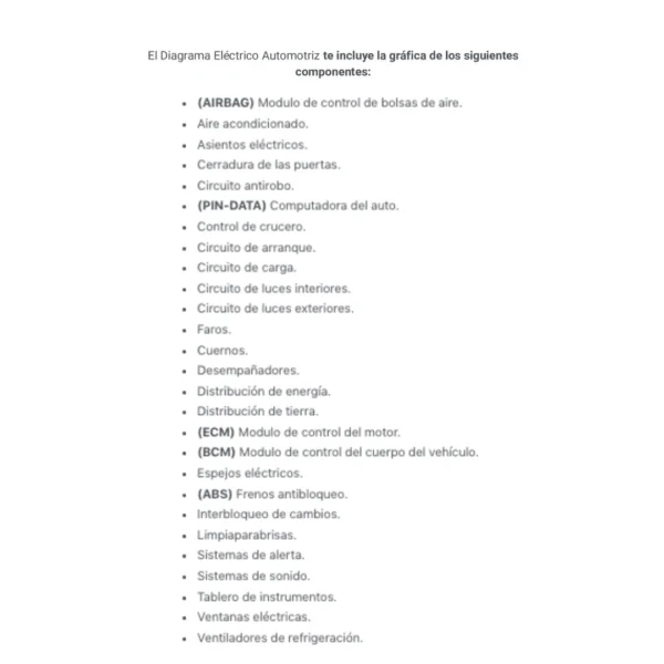 El Diagrama Eléctrico Automotriz te incluye la gráfica de los siguientes componentes: