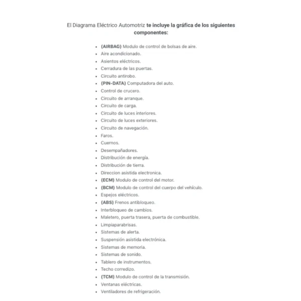El Diagrama Eléctrico Automotriz te incluye la gráfica de los siguientes componentes: