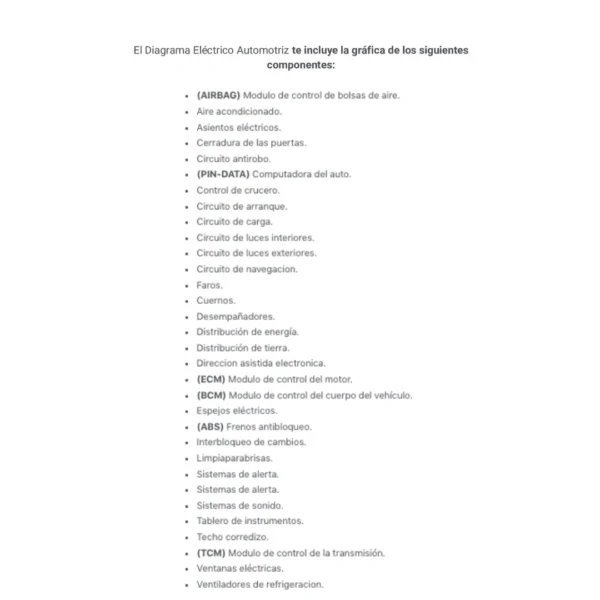 El Diagrama Eléctrico Automotriz te incluye la gráfica de los siguientes componentes: