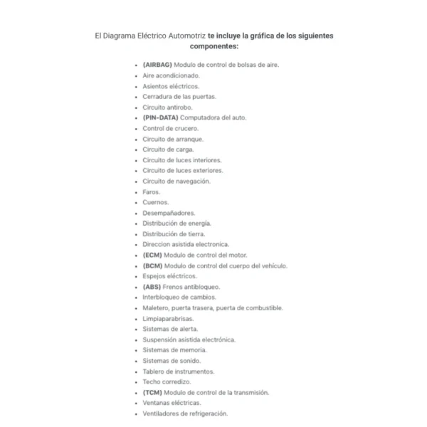 El Diagrama Eléctrico Automotriz te incluye la gráfica de los siguientes componentes: