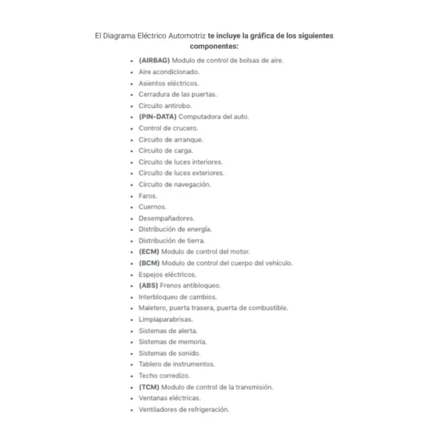 El Diagrama Eléctrico Automotriz te incluye la gráfica de los siguientes componentes: