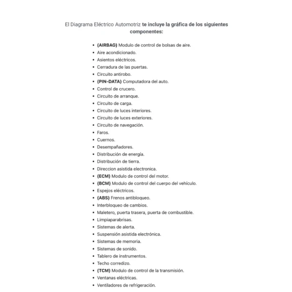 El Diagrama Eléctrico Automotriz te incluye la gráfica de los siguientes componentes:
