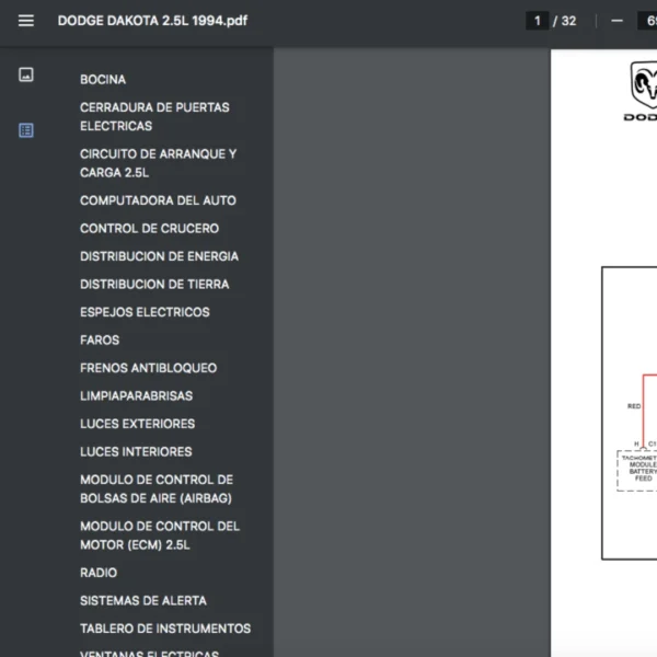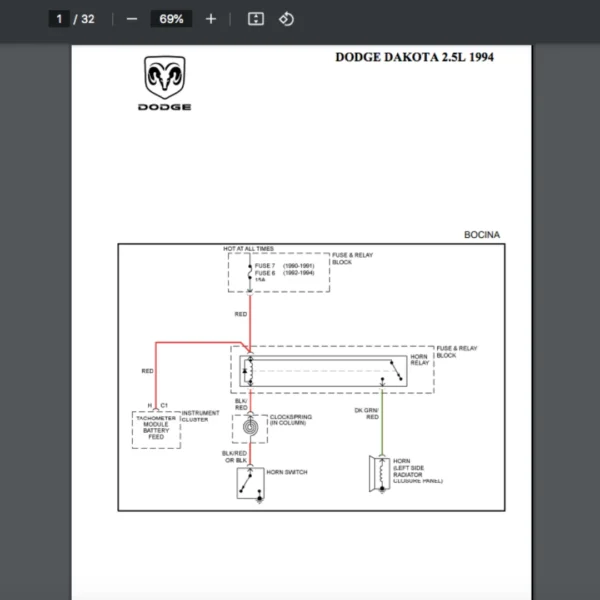Conexiones. Sensores. Y otros componentes que intervienen en el funcionamiento correcto de los circuitos electrónicos (también llamados en inglés “wiring diagram”). Si estas buscando un manual eléctrico de la marca Dodge modelo Dakota de 2.5L año 1994 , este es el diagrama automotriz que necesitas.
