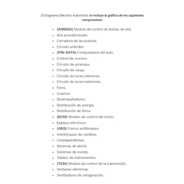 El Diagrama Eléctrico Automotriz te incluye la gráfica de los siguientes componentes: