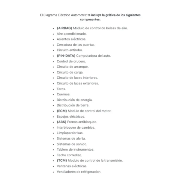 El Diagrama Eléctrico Automotriz te incluye la gráfica de los siguientes componentes: