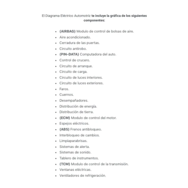 El Diagrama Eléctrico Automotriz te incluye la gráfica de los siguientes componentes: