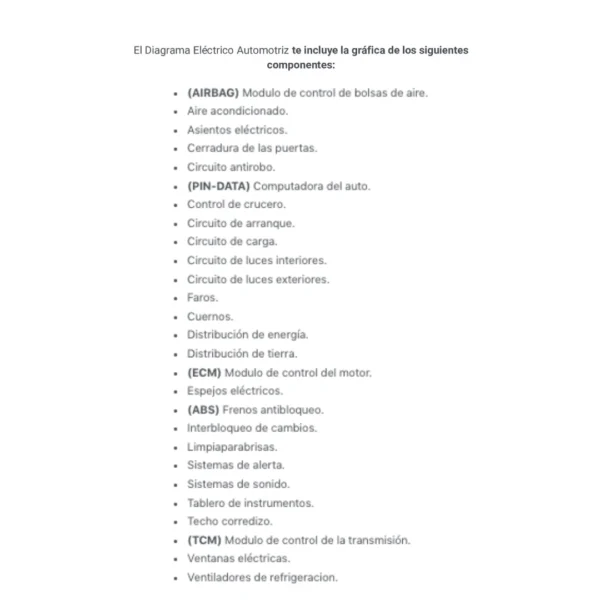 El Diagrama Eléctrico Automotriz te incluye la gráfica de los siguientes componentes: