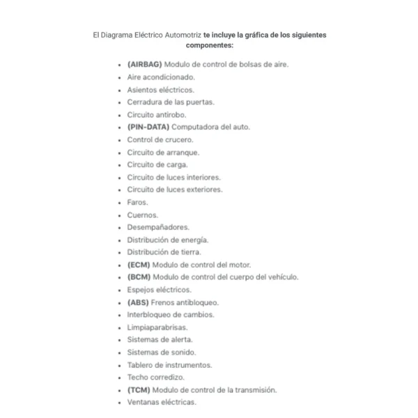 El Diagrama Eléctrico Automotriz te incluye la gráfica de los siguientes componentes: