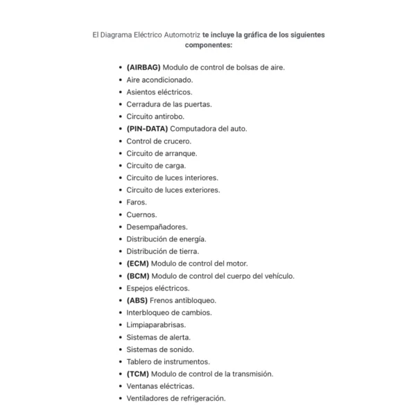 El Diagrama Eléctrico Automotriz te incluye la gráfica de los siguientes componentes: