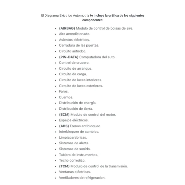El Diagrama Eléctrico Automotriz te incluye la gráfica de los siguientes componentes: