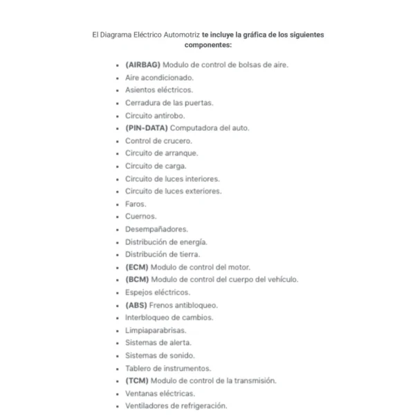 El Diagrama Eléctrico Automotriz te incluye la gráfica de los siguientes componentes: