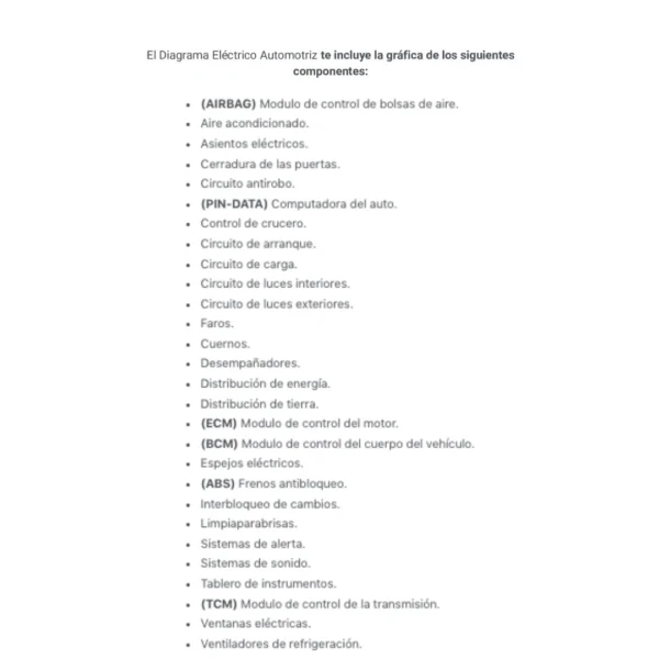 El Diagrama Eléctrico Automotriz te incluye la gráfica de los siguientes componentes: