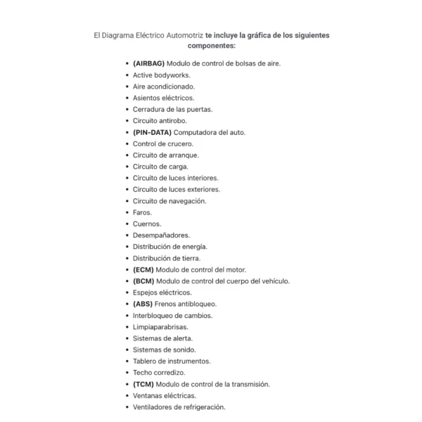 El Diagrama Eléctrico Automotriz te incluye la gráfica de los siguientes componentes: