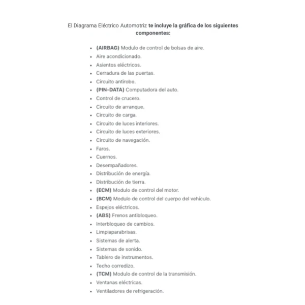 El Diagrama Eléctrico Automotriz te incluye la gráfica de los siguientes componentes: