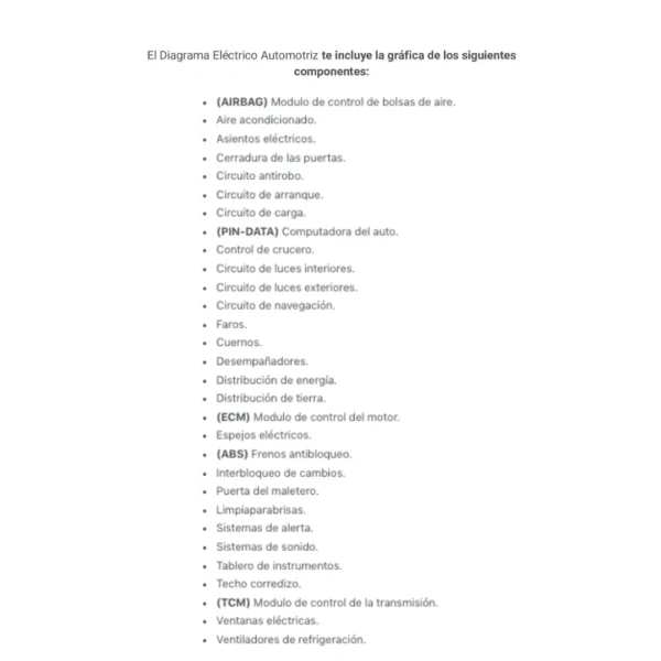 El Diagrama Eléctrico Automotriz te incluye la gráfica de los siguientes componentes: