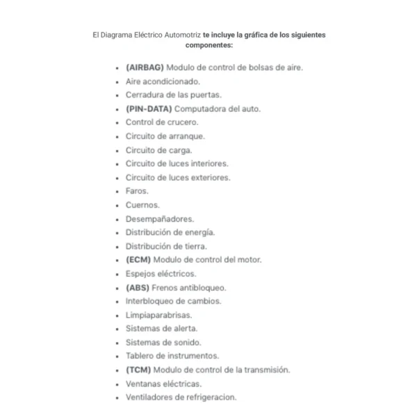 El Diagrama Eléctrico Automotriz te incluye la gráfica de los siguientes componentes: